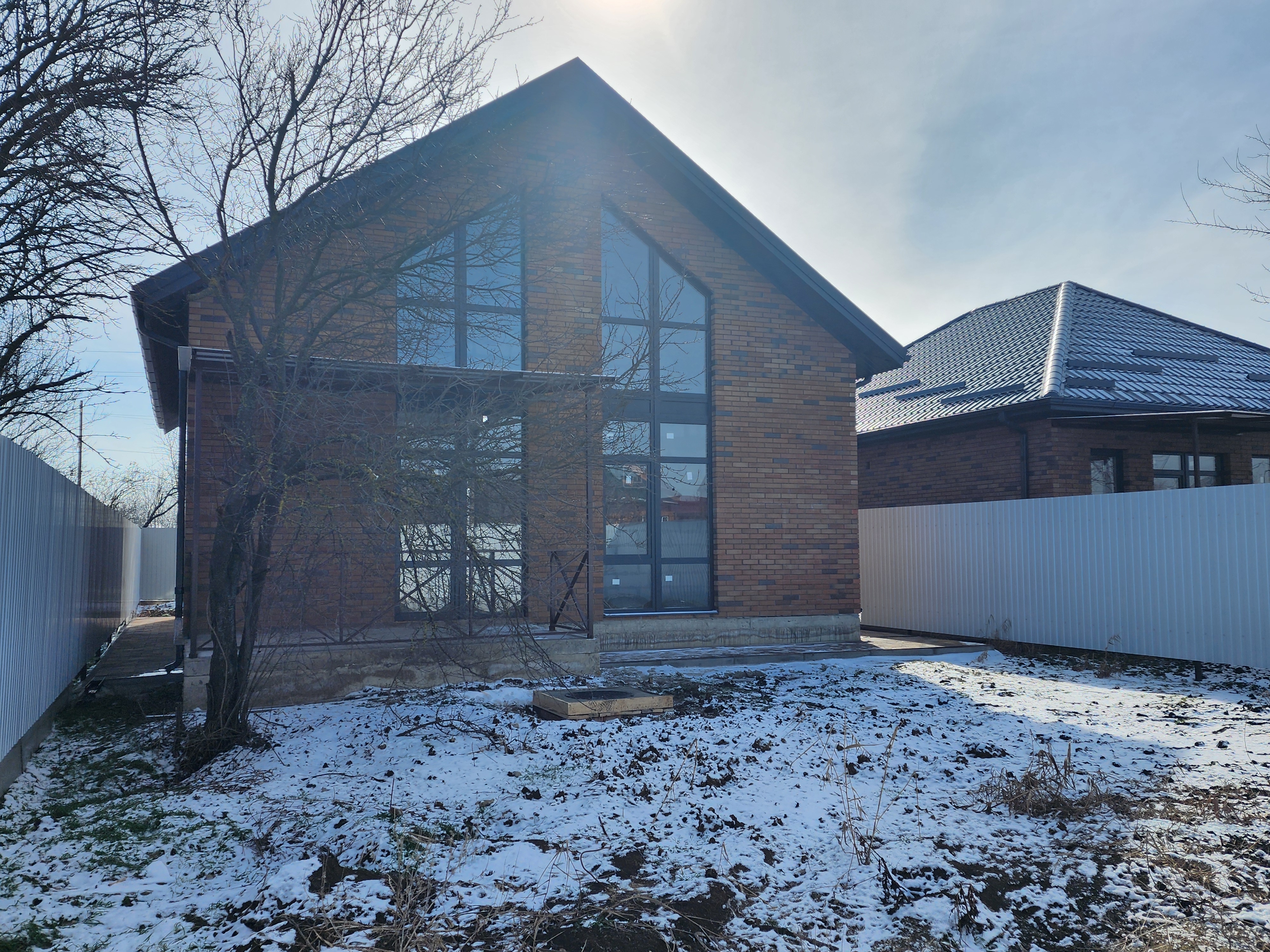 Дом с архитектурой премиум-класса. Двойной свет в гостиной — высота потолков до 6 метров, панорамное остекление. Фасад из декоративного кирпича — не требует обслуживания десятилетиями.